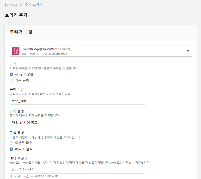 이렇게 하면 매일 UTC 기준으로 9시에 람다 코드가 실행되고 람다가 인스턴스를 중지시킬것이다.
