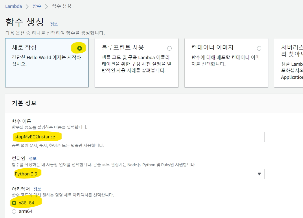 여기에서는 EC2를 종료하는 Lambda를 만들어보겠다.