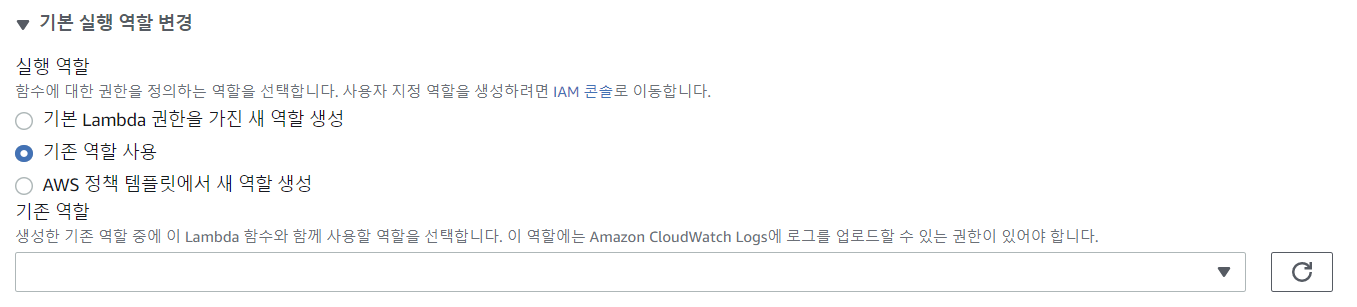 IAM에서 역할을 생성해두면 기존 역할 사용에서 선택이 가능하다.