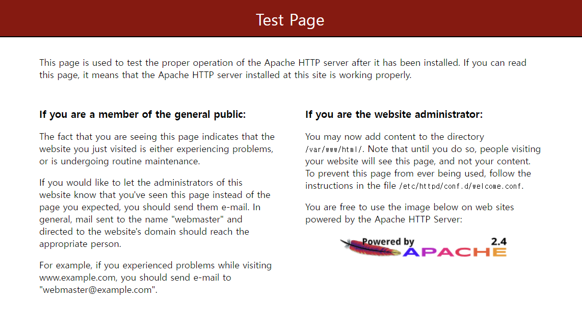 아래와 같이 테스트 페이지가 나오면 성공이다!!