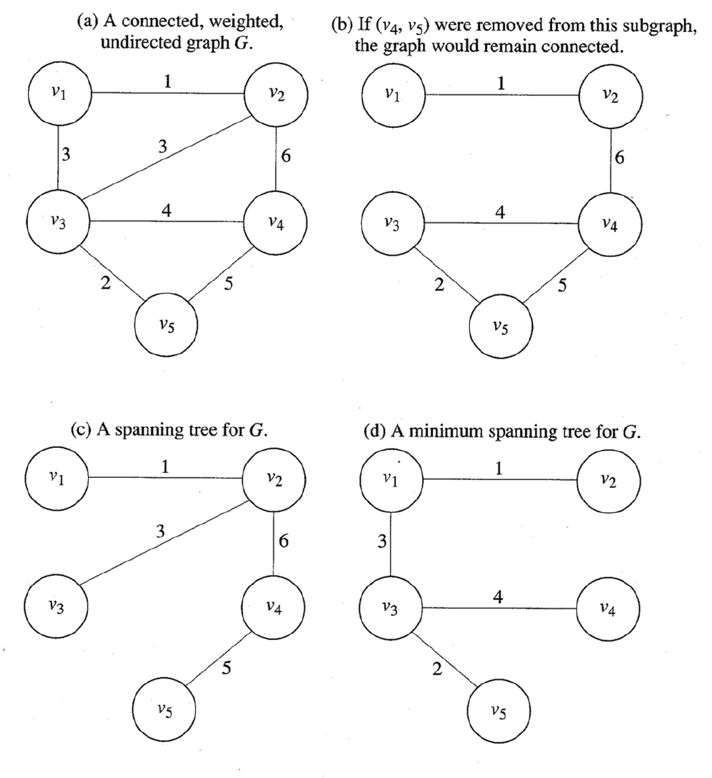 - 그림(b)은 Spanning Tree가 아니다. 노드 v3, v4, v5가 사이클을 이루기 때문이다.