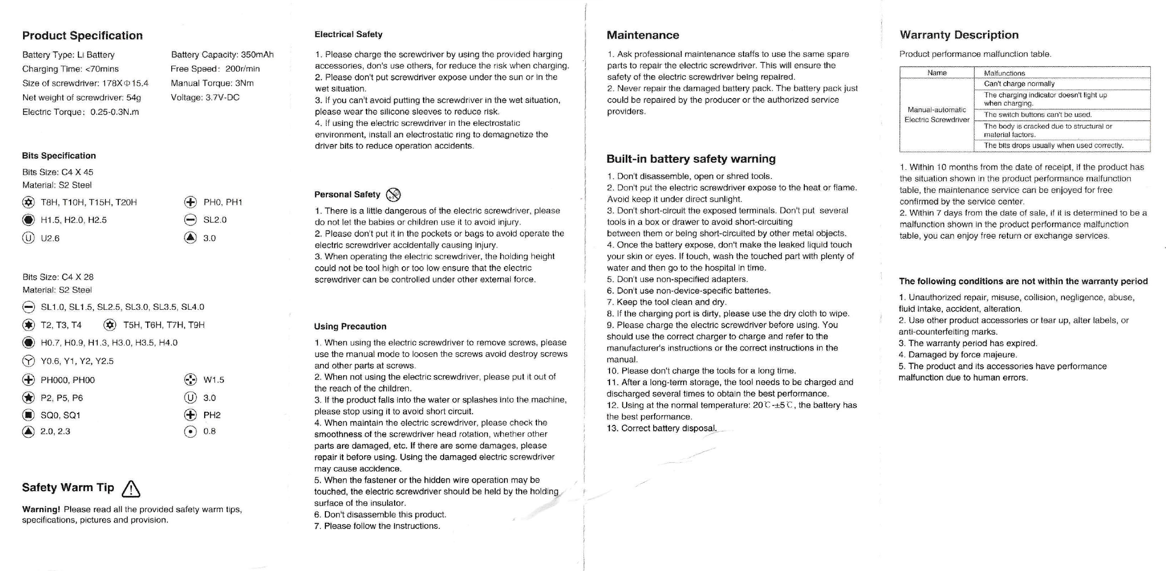 4. When maintain the electric screwdriver, please check the smoothness of the screwdriver head rotation, whether other parts are damaged, etc. If there are some damages, please repair it before using. Using the damaged electric screwdriver may cause accidence.