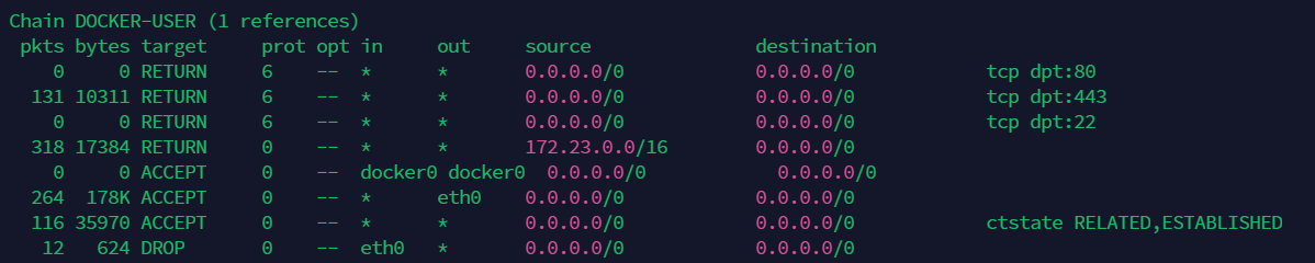 - A DOCKER-USER: -A는 규칙을 추가(append)하겠다는 의미. DOCKER-USER 체인은 도커가 생성하는 체인으로, 도커 컨테이너와 관련된 사용자 정의 규칙을 적용할 수 있는 체인.