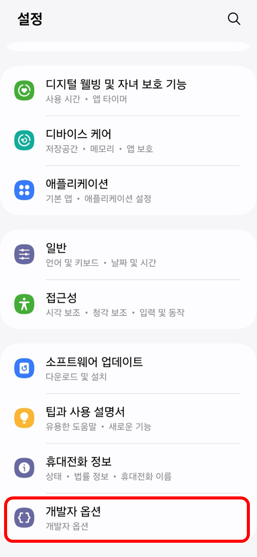 스마트폰 설정에 개발자 옵션 메뉴가 없는 경우는 마찬가지로 개발자 옵션을 활성화하면 된다.