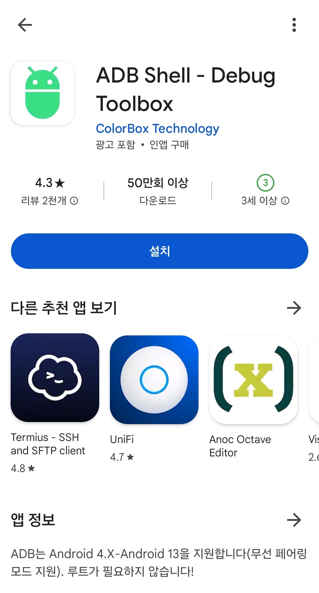 와이파이 환경 내에서 무선 디버깅을 활용하면 되는데 이를 위해 ADB shell이라는 어플을 사용해 보겠다.