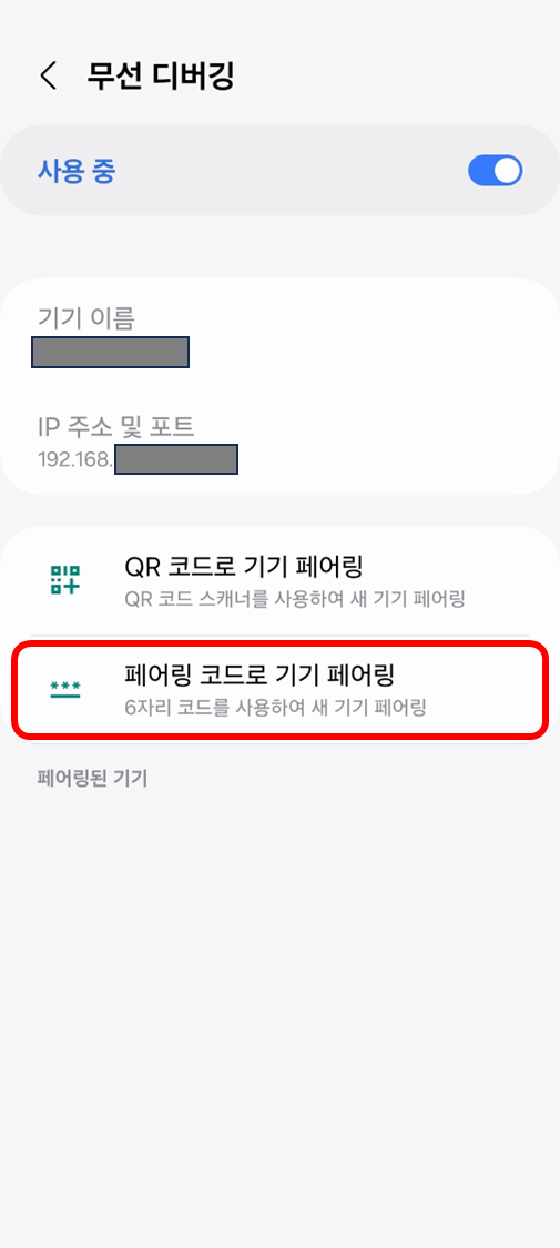 무선 디버깅을 활성화했다면, '페어링 코드로 기기 페어링'을 눌러 ADB shell에서 페어링을 하면 된다.