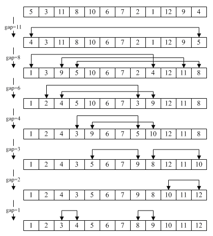 - 서로 멀리 떨어져있는 숫자들을 insertion sort로 정렬하기 시작하고, 점점 두 숫자들 사이의 거리(gap)를 좁혀서 정렬한다.